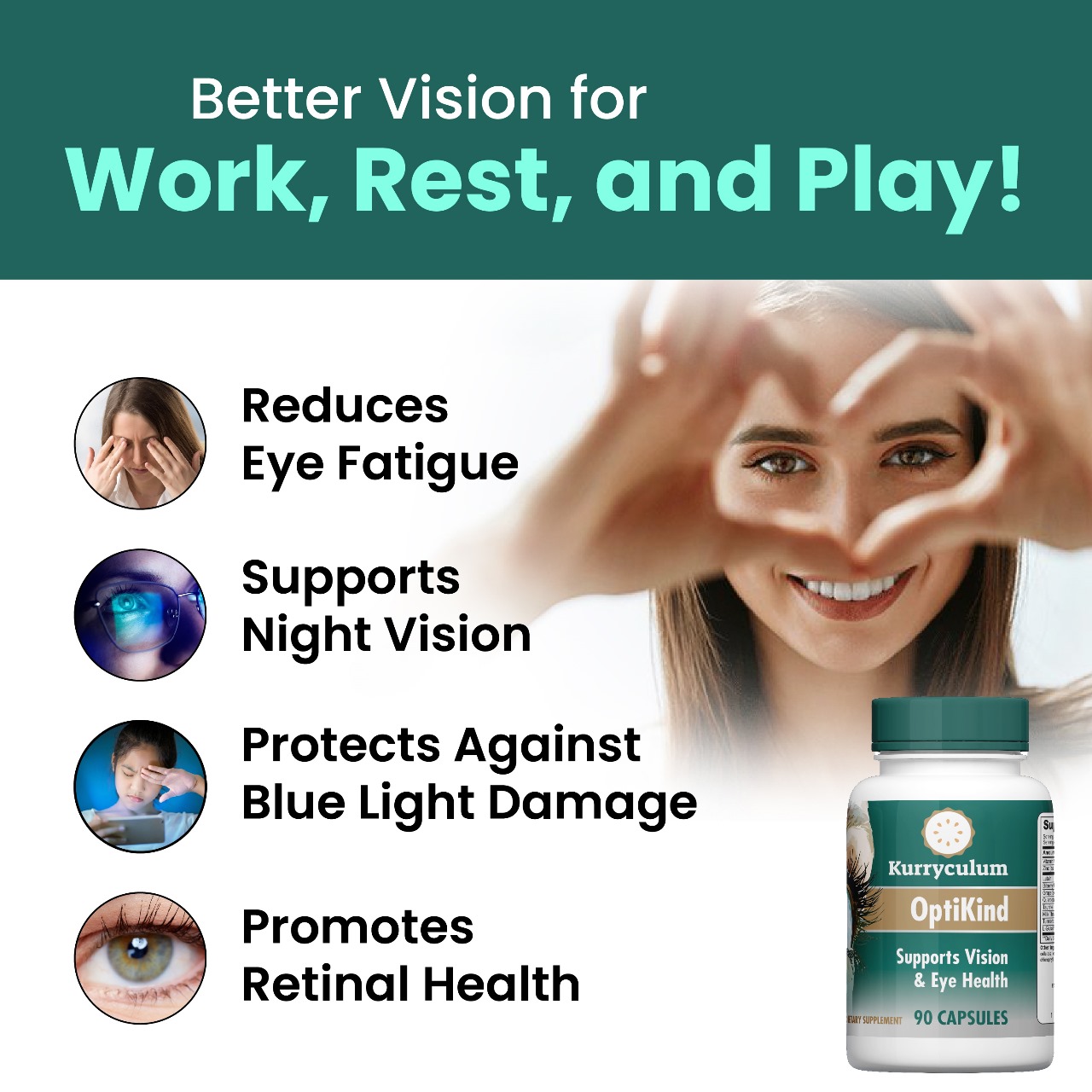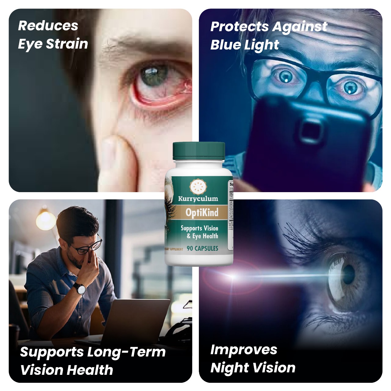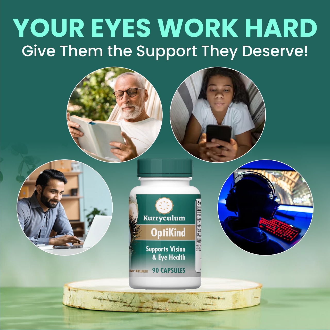 Kurryculum’s Optikind eye health supplement is a comprehensive formula designed to support your vision and eye health. Packed with a powerful blend of essential vitamins, minerals, and antioxidants like Lutein, Glutathione, Vitamin A, and Zinc, this supplement helps maintain healthy eyes, improve visual acuity, and reduce the effects of blue light exposure from digital devices. Formulated for long-term eye health, Optikind is a reliable choice for adults looking to protect their vision and keep their future in focus.
